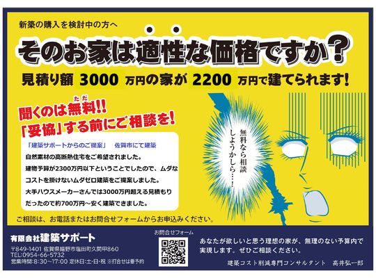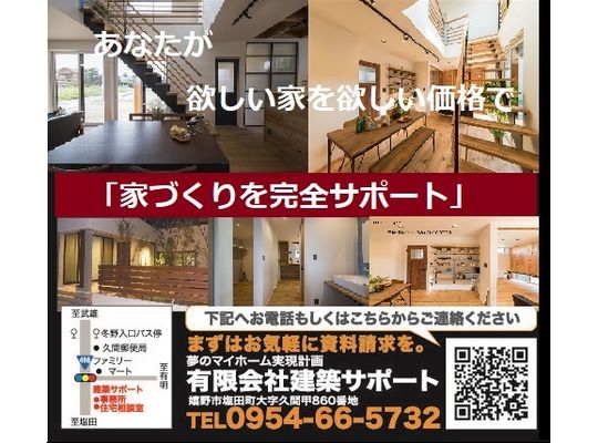 資金計画や土地選びのお手伝いもしている有限会社建築サポートでは、人生の大きな決断であるマイホームの建築で失敗しないためのノウハウをお客様にお伝えし、理想のライフスタイルを実現させております。高品質な材料の仕入れで安心の企画設計をしておりますので、佐賀でマイホームの新築を建てるご予定がありましたら、一度お問い合わせください。